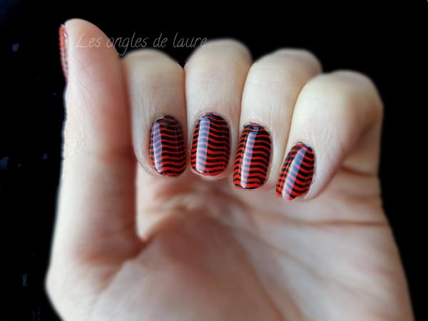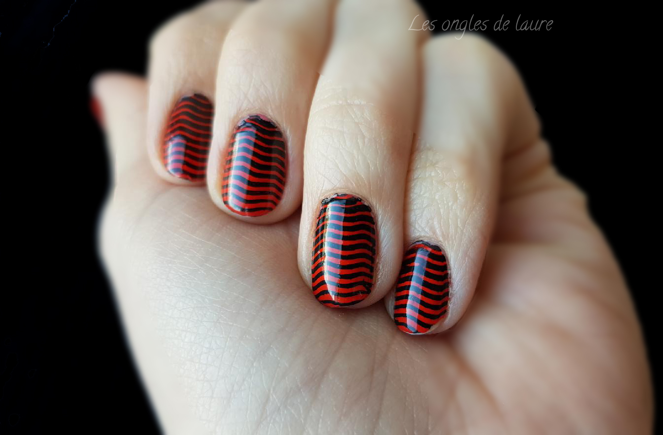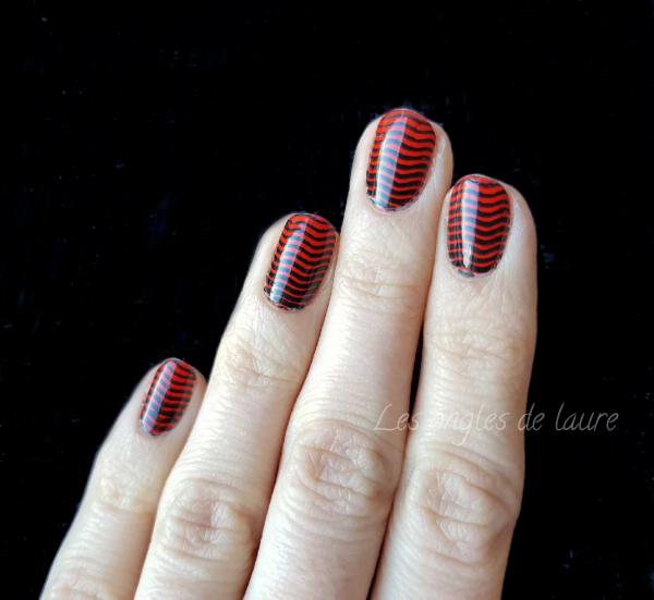 J'ai vraiment beaucoup porter cette manucure. Après avoir appliqué un vernis rouge, j'ai utilisé la plaque de stamping 37510 avec le vernis adapté. J'ai trouvé le rendu très original, avec cette illusion d'optique qui fait que l'on ne sait pas si ce sont des rayures rouges ou noires. Bref, j'ai beaucoup aimé cette manucure et je pense la refaire avec des couleurs différentes.